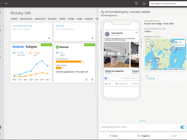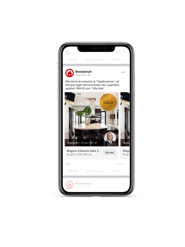 Vi har integrerat tjänsten för annonsering i sociala medier i Express Mäklarsystem. Här hanteras hela annonsproduktionen med minimal handpåläggning. Er logotyp hämtas från er Facebooksida och mäklarens porträttbild hämtas från Express. Även resultatrapportering ingår - du slipper logga in på andra webbplatser utan ser direkt i Express Mäklarsystem, tillsammans med övrig statistik för andra marknadsplatser, hur många annonser som exponerats eller klickats på.