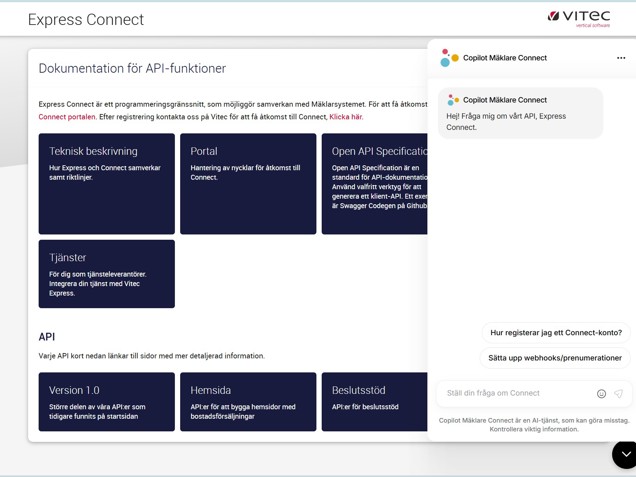Copilot Mäklare Connect är en AI-assistent som kan hjälpa dig med teknisk support kring vårt API Express Connect. Hjälpfunktionen består av en chatbot som med hjälp av AI har tränats på just teknisk support för att snabbt och detaljerat kunna svara på dina frågor.